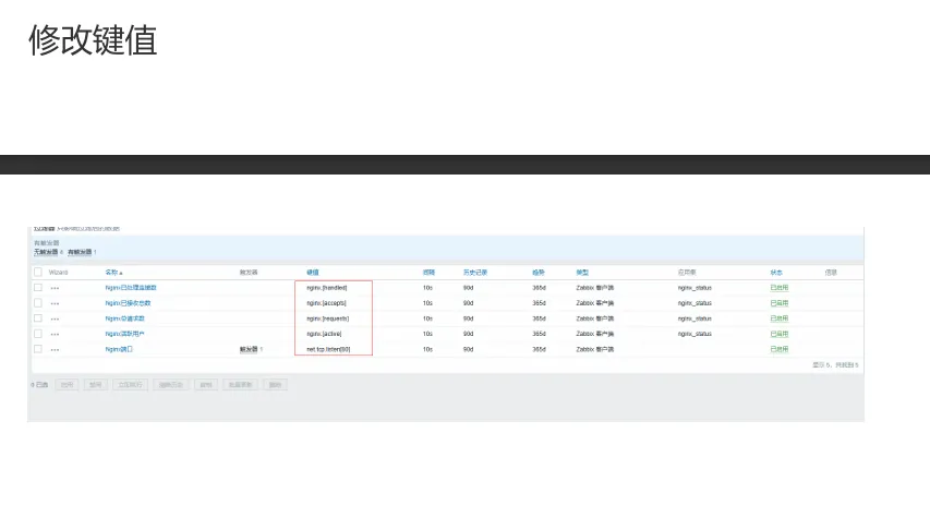 UserParameter=nginx_accept,curl -s 127.0.0.1/nginx_status|awk 'NR==3{print $1}'
